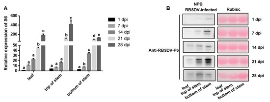 Rice black-streaked dwarf virus (RBSDV)-P6 accumulation in different parts of NPB. (A) Relative expression of RBSDV-P6 in different parts of NPB plants based on qRT-PCR analyses in which the average expression level of RBSDV-S6 in the leaves was set as 1 to estimate relative levels of gene expression in other parts of plants. (B) The expression level of RBSDV-P6 in different parts of NPB plants by Western blot. All data are shown as mean values ± SD error bars; different letters on bar graphs indicate significant differences by Duncan’s multiple range tests; p < 0.01.