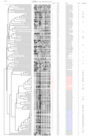 - Tenover, F.C.; Arbeit, R.D.; Goering, R.V.; Mickelsen, P.A.; Murray, B.E.; Persing, D.H.; Swaminathan, B. Interpreting chromosomal DNA restriction patterns produced by pulsed-field gel electrophoresis: Criteria for bacterial strain typing. J. Clin. Microbiol. 1995, 33, 2233–2239. [Google Scholar] [CrossRef] [Green Version]