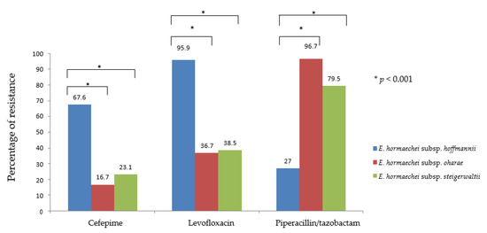 The statistical analysis among three predominant species (E. hormaechei subsp. hoffmannii, E. hormaechei subsp. oharae and E. hormaechei subsp. steigerwaltii) in cefepime, levofloxacin and piperacillin/tazobactam.