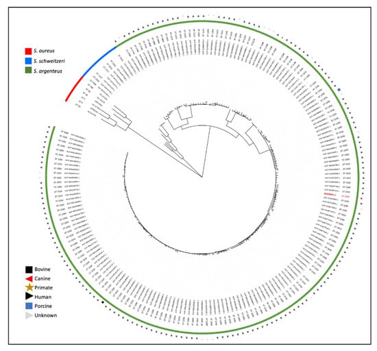 - Becker, K.; Schaumburg, F.; Kearns, A.; Larsen, A.; Lindsay, J.; Skov, R.; Westh, H. Implications of identifying the recently defined members of the Staphylococcus aureus complex S. argenteus and S. schweitzeri: A position paper of members of the ESCMID Study Group for Staphylococci and Staphylococcal Diseases (ESGS). Clin. Microbiol. Infect. 2019, 25, 1064–1070. [Google Scholar] [CrossRef] [PubMed]