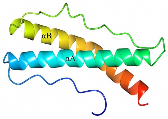 Crystal structure of B. burgdorferi BBA1426–118 (PDB ID 7QDV). The structure is colored from blue at the N-terminus to red at the C-terminus and includes the extra N-terminal residues Ala-Met-Gly from the expression tag. The α-helices are labeled as αA and αB.