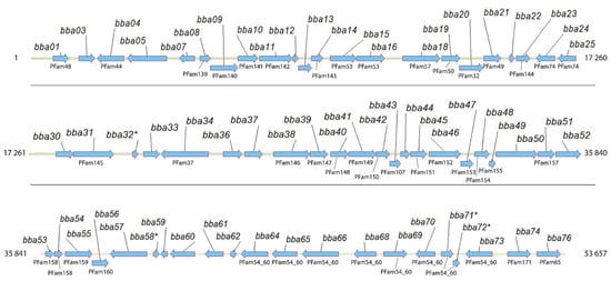 Full-length B. burgdorferi lp54 coding region corresponding to bba01-bba76. For those genes for which paralogs have been found, the corresponding PFam is indicated. Potential pseudogenes are indicated with an asterisk.
