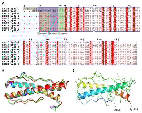 (A) Sequence alignment of B. burgdorferi PFam143 member proteins BBG25, BBA14, BBP26, BBN26, BBR26, BBQ33, BBM26, BBL26, BBO26, and BBS26. Sequence alignment was performed by using the Clustal Omega multiple sequence alignment tool and was further processed by ESPript 3 [,]. Conserved substitutions found between at least seven members used in the alignment are illustrated in red and framed, while the residues found to be identical between all of the PFam143 members are illustrated with a red background. The potential lipoprotein signal peptide cleavage site is indicated with an arrow, and the prediction of lipoprotein signal sequence regions is color coded, as indicated below the alignment. The numbering is illustrated for BBG25. For every member, the corresponding plasmid on which it is located is given in brackets. (B) Crystal structure of B. burgdorferi BBA14 (yellow, PDB ID 7QDV) superimposed with protein structures predicted with AlphaFold—BBG25 (red), BBA14 (green), BBP26 (cyan), BBN26 (pink), BBR26 (brown), BBQ33 (purple), BBM26 (gray), BBL26 (blue), BBO26 (magenta) and BBS26 (lilac). The N-terminal signal sequence region (hydrophobic α-helix) was excluded from the predicted protein structures. (C) Conserved residues between BBA14 and PFam143 members other than BBG25. The first and the last residues in BBA14 have been designated. A rainbow color scheme was used starting from blue at the N-terminus and gradually switching to red toward the C-terminus.