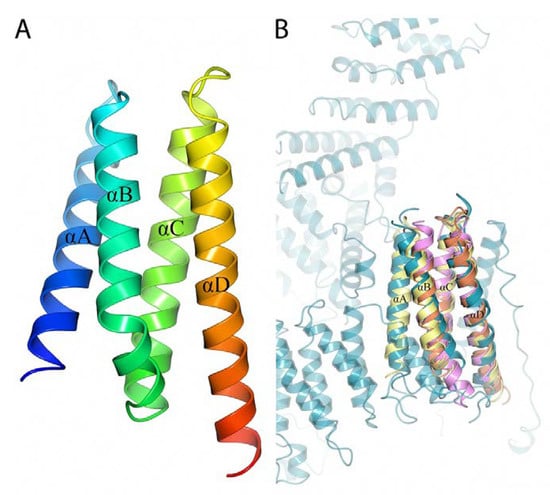 BBA14 and the antitoxin epsilon from S. pyogenes showed high overall fold similarity (Cα root-mean-square deviation of 2.90 Ǻ) but only 20% amino acid sequence identity. Although there is a noticeable structural variability at the loop regions, the α-helices that in the S. pyogenes antitoxin are responsible for the interaction with the toxin are largely conserved []. In case BBA14 or any other PFam143 member is an antitoxin, the low sequence similarity with the antitoxin epsilon from S. pyogenes is not unusual because antitoxins are characterized by substantial sequence and structural diversity []. The same applies for toxin molecules, which can show poor sequence similarity that makes it difficult to predict the toxin gene, if any, in B. burgdorferi, although usually the toxins are cotranscribed with antitoxins from an operon []. In the case of the previously mentioned operon ABCD found on cp32 and lp56, but incomplete on lp54 because it lacks orfC, the function for OrfC is still unknown, but the structure predicted with AlphaFold reveals a four-helical bundle protein (Figure 5A).