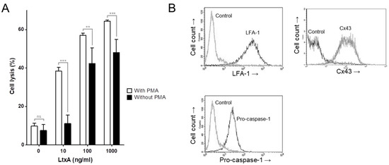 Figure 1. Characterizations of PMA stimulated and native THP-1 cells. (A) THP-1 cells, PMA stimulated or native, exposed to different concentrations of A. actinomycetemcomitans LtxA for 2 h. Leukotoxicity is expressed as the activity of LDH released from the damaged cells (cell lysis) compared to that of triton-lysed control cells (100%, not shown) (mean ± SD, n = 3 for with PMA and 5 for without PMA, ** p ≤ 0.01, *** p ≤ 0.001). (B) Expression of LFA-1, pro-caspase-1 and connexin 43 (Cx43) in native THP-1 cells. Right peaks represent fluorescence from cells labeled with the specific conjugated antibodies, and left peaks represent cells labeled with the corresponding conjugated isotype control. Representative results are shown.