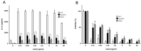 Figure 2. Effect of inflammasome modifications on LtxA-exposed THP-1 cells. PMA-stimulated THP-1 cells (wt, NLRP3 or ASC) were exposed to different concentrations of A. actinomycetemcomitans LtxA for 2 h. Significant differences between knockout cells and wt cells are indicated (* p ≤ 0.05. *** p ≤ 0.001). (A) IL-1β release into cell culture supernatants of the exposed cells determined by quantitative ELISA (mean ± SD, n = 3). Deletion of the inflammasome genes NLRP3 and ASC significantly inhibited LtxA-induced IL-1β release with significantly more inhibition in ASC cells at low LtxA concentrations. (B) Cell viability estimated by quantitative uptake of neutral red by the LtxA exposed cells (mean ± SD, n = 3). Deletion of the inflammasome genes NLRP3 and ASC significantly inhibited LtxA-induced cell lysis with no significant differences between the two modifications.