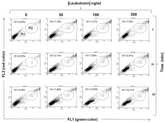 Figure 3. Effect of LtxA on THP-1 cell-to-cell communication. Time and dose screening of LtxA exposure on the activity of cell-to-cell communication in native THP-1 cells. The number of cells in R1 represents the recipient cells absorbing the fluorescent green color from the donor cells (upper right corner) when stimulated by different concentrations of LtxA (0, 30, 100, 300 ng/mL) for various times (5, 15, or 30 min). Cells in the lower-left corner are unstained recipient cells.