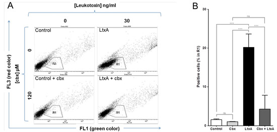 Figure 4. Effect of LtxA in THP-1 cell-to-cell communication. Native THP-1 cells were exposed to 0 ng/mL or 30 ng/mL of LtxA for 30 min ± 120 µM carbenoxolone (cbx). (A) Representative plots of LtxA-induced cell-to-cell communication analysed with the parachute technique. (B) Statistical data of cell-to-cell communication (mean ± SD, n = 3, *** p ≤ 0.001).