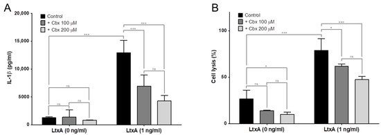 Figure 5. Effect of cell-to-cell communication in LtxA-induced monocyte activation. Human adherent blood-derived monocytes were exposed to LtxA (1 ng/mL) ± cbx (100 or 200 µM) for 2 h (mean ± SD, n = 6 for controls and 4 for exposed samples, * p ≤ 0.05. *** p ≤ 0.001). (A) LtxA induced IL-1β secretion determined in the cell culture supernatants by ELISA. (B) LtxA induced cell lysis determined as the activity of LDH released from the damaged adherent monocytes.