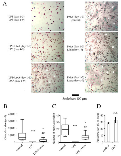 Figure 6. Osteoclast differentiation of THP-1 cells with and without LtxA. All cell cultures were differentiated with RANKL and α-tocopherol from day 4–9. LPS and/or LtxA were added as stimuli on days 1–3 and/or days 4–9. Control cells were differentiated with PMA (day 1–3) and with RANKL and α-tocopherol (day 4–9) (A) Microscopy images of cells differentiated under different conditions. Green: nuclei stained by methyl green, red: tartrate-resistant acid phosphatase (TRAP). White arrows: multinucleated cells. (B) The size of osteoclast-like cells and (C) number of nuclei seen per cell. LPS + LtxA: cells were incubated with both stimuli on days 1–3, followed by incubation with LtxA on days 4–9 in addition to RANKL and α-tocopherol. Kruskal–Wallis test, *** p ≤ 0.0001 and * p ≤ 0.05 compared to control, ## p ≤ 0.01 compared to LPS (medians and ranges, n = 2 independent experiments in duplicate). (D) Pit formation ability of osteoclast differentiated THP-1 cells on 40 µm thick bovine cortical bone slices. Differentiation was achieved by exposing cells to PMA for 3d, followed by stimulation with RANKL, α-tocopherol with or without LtxA. Light microscopy was performed, and the surface area of pits in percent was determined by color filtration and binarisation. Two-tailed unpaired Student’s t-test, p = 0.23. (mean ± SD, n = 2 independent experiments in duplicate).