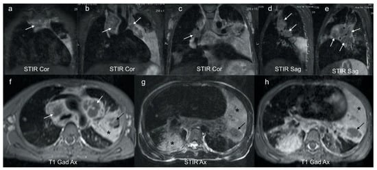 (a–h): Coronal, sagittal and axial MRI in a 6-year-old girl with confirmed pulmonary TB. Coronal (a–c) and sagittal STIR (d,e) images demonstrate characteristic low signal TB lymphadenopathy (white arrows) in the right and left paratracheal, and hilar regions. These can be compared with the higher signal axillary lymph nodes in image (c) which represent the appearance of non-TB nodes. Axial post gadolinium T1 at the level of the aortic arch (f) demonstrates that the STIR low signal lymphadenopathy in (a–e) demonstrates rim enhancement (white arrows), typical of centrally necrotic TB nodes. In addition, there is homogenous enhancement of a dense left consolidation (star) with an area of non-enhancing low signal (black arrow), in keeping with parenchymal breakdown within the consolidation. The axial STIR (g) and corresponding gadolinium enhanced T1 (h) at the lower zone of the lungs demonstrates an intermediate-to-high STIR signal enhancing consolidation posteriorly on the right (star) in keeping with viable lung; an intermediate STIR signal, poorly and heterogeneously enhancing consolidation on the left (star) in keeping with at risk lung; and a T2 low STIR signal non-enhancing focal area on the left (black arrow) typical of TB necrosis (this is the opposite to the STIR signal of an abscess, which would be bright).