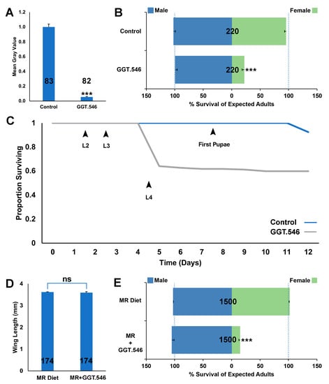 Yeast larvicide GGT.546 functions as a female-specific larvicide in Aedes aegypti. (A) Silencing of GGT in A. aegypti following larval consumption of GGT.546 yeast was verified through mean grey value quantification of GGT transcripts following in situ hybridization experiments performed on L4 brain tissue (*** = p < 0.001, Student’s t-test; error bars denote standard deviation). Larval consumption of GGT.546 yeast resulted in significant female larval mortality (B), which occurred primarily in the third instar (GGT.546-treated larvae = gray line in survival curve shown in (C); compared with the blue line, which denotes the survival of control-interfering RNA yeast-treated larvae), yet did not significantly impact survival of males through adulthood (p > 0.05, chi-squared test). (D) No significant differences in mean wing lengths were detected in adult males reared following scaled rearing of larvae on a mass-rearing diet prepared with GGT.546 yeast (MR+GGT.546; p > 0.05 vs. wings from males reared on the standard mass-rearing diet (MR Diet), which served as a control, t-test). Although the consumption of MR+GGT.546 resulted in significant female mortality, it had no impact on male survival (E). The results shown in panels (B,C) correspond to container trials performed on 20 larvae per replicate container; results from larvae that had consumed control-interfering RNA yeast, which had no impact on male or female survival (p > 0.05, chi-squared test) are shown for comparison. Results shown in (D,E) correspond to trials performed in scaled rearing trays containing 500 larvae that consumed the MR diet or the MR+GGT.546 diet; data are shown as mean survival through adulthood; *** = p < 0.001, chi-squared test. Throughout this figure, the N numbers for each treatment are indicated on the respective columns of each bar graph, and error bars represent standard errors of the mean.