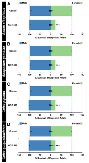 Rearing A. albopictus larvae on GGT.566 yeast resulted in significantly higher than expected male:female ratios (Figure 2A, p < 0.001). Although only 22 ± 3% of expected A. albopictus female mosquitoes treated with GGT.566 emerged as adults (Figure 2A, p < 0.001), no significant impact on male survival was observed (Figure 2A, p > 0.05). Likewise, although GGT.560 had no significant impact on the survival of males through adulthood (Figure 2B, p > 0.05), only 22 ± 2% of expected A. gambiae female mosquitoes survived through adulthood (Figure 2B, p < 0.001), resulting in a significantly higher male:female ratio among adult survivors (Figure 2B, p < 0.001). Finally, significantly higher than expected male:female ratios were also observed among both C. pipiens (Figure 2C, p < 0.001), and C. quinquefasciatus (Figure 2D, p < 0.001) adult survivors following larval rearing on GGT.566 yeast, a difference that coincided with 22 ± 3% of expected C. pipiens (Figure 2C, p < 0.001), and 22 ± 3% of expected C. quinquefasciatus (Figure 2D, p < 0.001) female adult emergence, yet had no impact on male survival of either species (Figure 2C,D, p > 0.05).