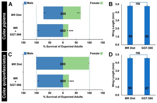 To assess whether the RNAi-based yeast larvicides could also facilitate scaled production of C. pipiens complex male mosquitoes, a larval diet and feeding regimen employed at Aedes mass-rearing facilities [30] was modified through replacement of the nutritional yeast component of the diet with dried inactivated yeast larvicide GGT.566, as well as through the addition of Koi food, a typical component of the Culex larval laboratory diet. The modified diet was tested on both C. pipiens (Figure 3A) and C. quiquefasciatus (Figure 3C) larvae grown in scaled larval rearing trays. Under these conditions, the larvicides continued to induce significantly higher than expected C. pipiens male:female ratios (Figure 3A, p < 0.001) resulting from significant female-specific mortality (Figure 3A, p < 0.001); however, there was no significant impact on male C. pipiens survival (Figure 3A, p > 0.05) or wing lengths (Figure 3B, p > 0.05), which correlate with fitness. Similarly, the modified diet permitted scaled rearing of fit C. quinquefasciatus males, with GGT.566 diet treatments inducing significantly higher male:female ratios (Figure 3C, p < 0.001) resulting from significant female-specific mortality (Figure 3C, p < 0.001), but no significant impact on male C. quinquefasciatus survival (Figure 3C, p < 0.001) or fitness, which was not measured directly but estimated through measurement of wing lengths, which were not significantly different (Figure 3D, p > 0.05).