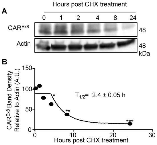 CAREx8 has a half-life of approximately 2 h. (A) Calu-3 cells were treated with 30 μg/mL cycloheximide. The cells were lysed at the times indicated post cycloheximide addition and analyzed by WB using a CAREx8-specific primary antibody (5678p) or actin (loading control). (B) Quantification of CAREx8 bands normalized to actin. Error bars represent SEM. (* p < 0.05; ** p < 0.01; *** p < 0.001; One-Way ANOVA; N at least 3).