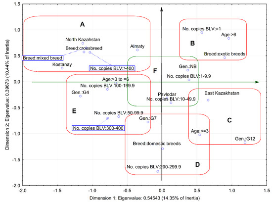 Multivariate analysis was applied on four variables including breed, age, geographical location of farms, and the genotypes of BLV found in the infected cattle with respect to provirus copy number. After plotting all these variables, it was possible to determine discrete differences between proviral load with respect to particular categories of variables within a single graph (Figure 1). Blue points represent each category of analyzed variables. The highest copy number (≥400) created a separated cluster (A), and it was associated with the occurrence of infected cows in two regions—North Kazakhstan and Kostanay—and with infections found in crossbreed (Black and Motley) and mixed breed (Holstein/Black and Motley) cattle (PG = 1.17) (point G). The highest proviral load was also correlated with infection caused by the G4 genotype, although the correlation was not statistically significant (PG = 0.34). Analysis of association between copy numbers varied from 300 to 400, 100 to 199.9, and 50 to 99.9 copies and all variables showed almost identical results and it was therefore treated as homogeneous data in the multivariate analysis. This cluster (E) was characterized by statistically significant association with cattle at an age between 3 and 6 years, an infection caused by the genotype G4 and G7 (PG = 0.83). The occurrence of a copy number between 200 and 300 (cluster D) was significantly correlated with the occurrence of cattle representing ingenious breeds (Alatau, Kazakh white-headed, local without breed), under 3 years of age, and with infections caused by BLV strains belonging to genotype G7 (PG = 1.20). Provirus copy numbers from 1 to 10 and 10 to 50 were associated with animals from regions such as Pavlodar (cluster F). However, multivariate analysis showed no statistically significant association with any of the variables studied (PG = 0.26). If any correlations were observed, they were rather of a random nature. In contrast, proviral load at single copy level was significantly correlated (PG = 1.10) with cattle representing exotic breeds (Simmental and Santa Gertrude), aged over 6 years, as was seen in cluster B. Finally, we identified the last cluster (C) in which a statistically significant correlation (PG = 1.16) was noted between the circulation of genotype G12 and cattle with a different number of copies, at age less than 3 years from East Kazakhstan.
