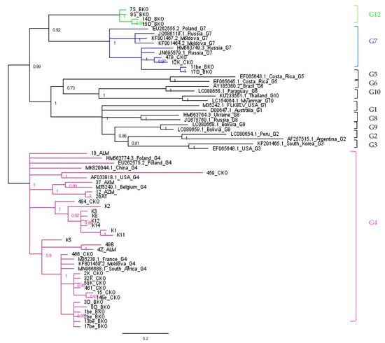 To confirm the data from ML analysis showing the affiliation of four sequences to the new genotype G12, Bayesian interference (BI) was performed using MrBayes with the GTR substitution model and 37 BLV sequences already classified by ML tree (Figure 3). The ML and BI trees showed congruent results. The MrBayes tree topology indicated that four of Kazakhstan BLV strains cluster into a unique clade with a high posterior probability of value 1.00, which confirmed the presence of a new genotype G12 (Figure 3). In addition to confirming whether these four isolates belonged to the new G12 genotype, the mean genetic distances within and between BLV genotypes G1–G10 and G12 were calculated (Table 2), using data available from GenBank. Sequences were downloaded from NCBI during July 2021. In order to identify BLV sequences the following search terms were used: ((“Bovine leukemia virus”[Organism] OR Bovine Leukemia Virus[All Fields]) AND env[All Fields] AND (“Bovine leukemia virus”[Organism] OR BLV[All Fields])) AND (“903”[SLEN]: “9000”[SLEN]). Sequences representative for genomic DNA from Bos taurus were exclusively included in this analysis. Then, the sequences were manually inspected, aligned, and cropped to 903 bp using BioEdit software [29]. Sequences that have been assigned to the particular genotype at least one time were used. This resulted in 254 original sequences ( including genotype G12) listed in Table S2. As was shown in Table 2 the mean distances between genotype G12 and other genotypes varied from 2.5% to 4.0%, and these values were higher than the lowest value of 1.9% quoted between G8 and G9. Furthermore, the mean genetic distances between genotype G12 and other genotypes were higher than the mean intragenotype distances, within each of the analyzed genotypes.