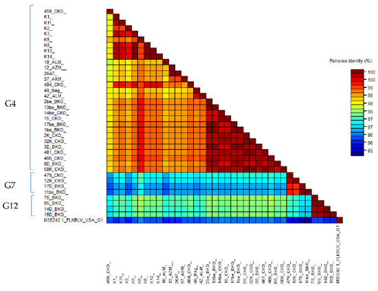 Pairwise comparison of 37 of 903 bp-long sequences and 41 of 400 bp-long sequences obtained from Kazakhstan and the FLK-BLV sequence, representative for genotype G1, was carried out. The identity scores were represented as color-coded blocks using SDT v.1.2 software [30] (Figure 4) and numerical values are shown in excel files (Table S3). Generally, the sequence identity among 903 bp-long sequences varied between 96.3–100%. Pairwise identity of sequences representing genotypes G4, G7, and G12 ranged from 98.2 to 100%, 99.2 to 100%, and from 99.9 to 100%, respectively. When pairwise comparison was extended over the four sequences, 400 bp long, generally the sequence identity was similar to those noted for longer fragments and varied between 96.8 and 100%. In particular, the identity varied between 98.3–100% for genotype G4, 99.3–100% for G7, and 99.8–100% for new genotype G12 (Figure S2; Table S3).