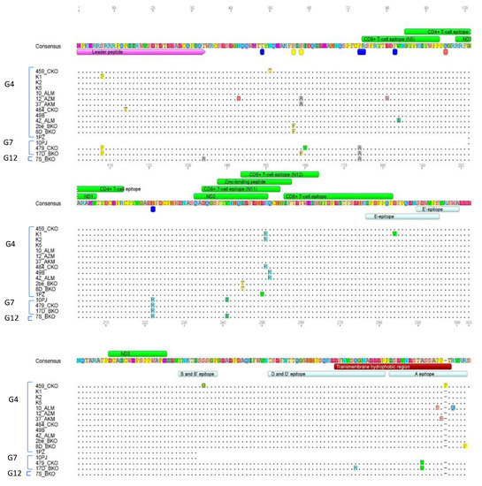 In total, 27 amino acid substitutions were found in this study in epitopes or functional domains of gp51 such as epitopes G and H, CD8+ T-cell epitope, neutralizing domain 2 (ND2), CD8+ T-cell epitope (N11 and N12), and Zinc-binding peptide, not at a random location. Interestingly, 86% of all amino acid substitutions reported here have been described previously [12,21,58,59]. Their identification in the analyzed env-gp51sequences indicates that the sequences of the genotype G7 were more conserved than those of the genotype G4. Four substitutions (P13T, N42D, N50T, R298Q) were found to be unique for Kazakhstan aa sequences. What should be highlighted is that substitution T33A was typical of the newly identified G12 genotype.