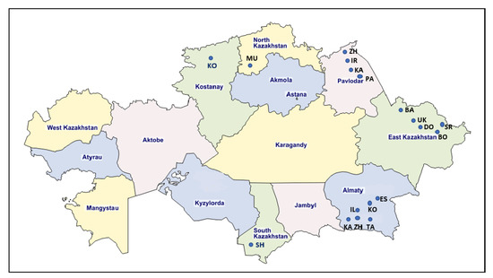 Map of Kazakhstan showing the location of regions and farms, from which samples were obtained for testing. Adapted map of Kazakhstan originally comes from https://d-maps.com (accessed on line 13 January 2022).
