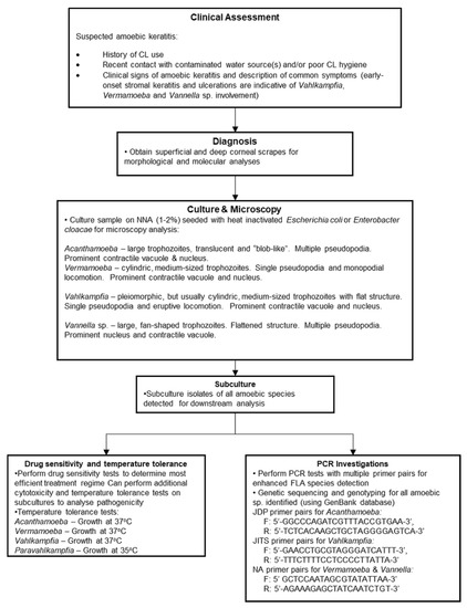 The similarities to AK infections complicate diagnoses. Generally, treatment outcomes of AK infections coincide with the speed by which accurate diagnoses can be made [7,30]; thus, a similar emphasis should be placed on rapid diagnosis in non-Acanthamoeba amoebic keratitis. Differentiation between amoebic infections is difficult; despite this, early onset stromal keratitis and ulcerations are indicative of Vahlkampfia, Vermamoeba and Vannella sp. involvement and could be useful during early observations (see Table 1) [9,11,13,14,15,17,19,20,22,24]. While microscopic and culture techniques can be applied during diagnostics, species identification using PCR tests remains the most accurate strategy for diagnosis and should be utilised at the earliest possible convenience [1]. We provide a more comprehensive diagnostic workflow for suspected amoebic keratitis in Figure 2. The presence of co-infectious agents in amoebic keratitis is common, and several non-amoebic species were also identified that can complicate treatment, diagnosis and the overall understanding of amoebic influence during infections [11,12,17,18]. For example, Kennedy et al. (1995) [11] reported growth of Staphylococcus aureus from corneal swabs, while Aitken et al. (1996) [12] noted the presence of yeast-like fungi on the corneal surface of the patient. Advances in molecular techniques allow more comprehensive screening for co-infectious agents and should be conducted in tandem with a traditional culture-based approach to assess the most appropriate course of action for the patient.
