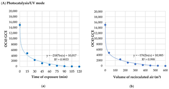 In Photocatalysis/UV mode, RNA concentration of OC43 virus was reduced by 90% within 45 min (225 m3 of recirculated air), and it was not detectable after 120 min (600 m3 of recirculated air). Regression curves showed that the reduction in OC43 GCE had a logarithmic trend (Figure 1) with a strong correlation both between GCE and time of exposure (Figure 1(Aa,Ba)) and volume of recirculated air (Figure 1(Ab,Bb)).