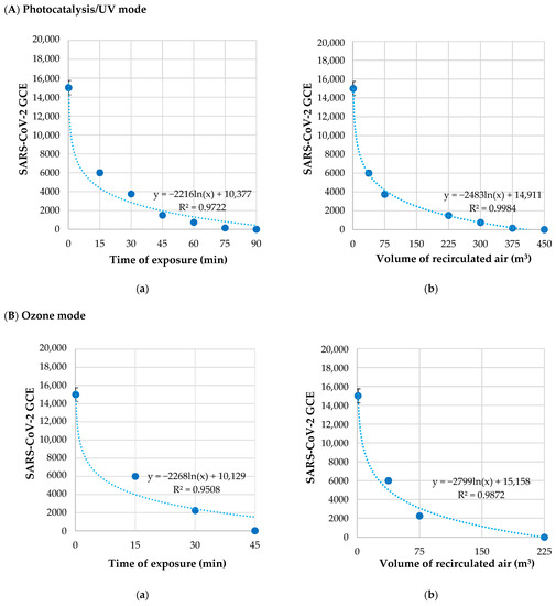 The SARS-CoV-2 RNA concentration related to the time of exposure and the volume of recirculated air under Photocatalysis/UV or Ozone modes is plotted in Figure 2.