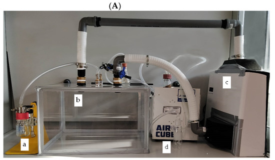 In Figure 3, the laboratory test system (Figure 3A) and the experimental setup (Figure 3B) used in this study are reported. The viral aerosol generated by an ATM221 nebulizer (Topas GmbH, Dresden, Germany), using compressed air at an operating pressure of 1.5 bar (a), was injected into a recirculation plexiglass chamber (b), with dimensions 500 mm (W) × 450 mm (L) × 300 mm and 67.5 dm3 in volume. The top of the chamber was connected to the air sanitizer Zefero (c) by tubes (40 mm diameter) with 3D printed adapters sealed to the front and upper grilles (device air input and output, respectively) to recirculate the aerosol. The top of the chamber also had an inlet for aerosol entry and a two-way output for air exhaust (connected to a 0.22 µm filter) or aerosol recovery by liquid impinger (Bio-Sampler, SKC Inc., Nottingham Township, PA, USA) (d). A vacuum pump (AirCube COM2, AMS Analitica, s.r.l., Pesaro, Italy) was used at a flow rate of 10 L min−1 for 30 min. The total volume of the laboratory test system, encompassing the plexiglass chamber, tubes and air sanitizer, was 86 dm3.