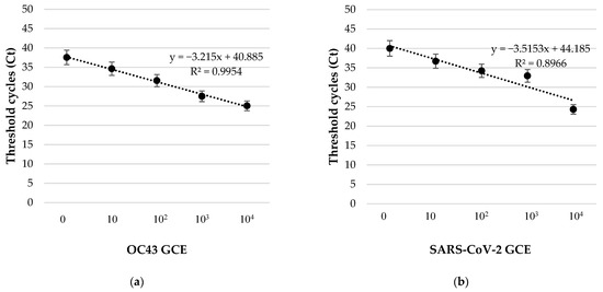 Standard curve of OC43 (a) and SARS-CoV-2 (b) genomic RNA, expressed as Genome Copy Equivalents (GCE) vs. Ct values.