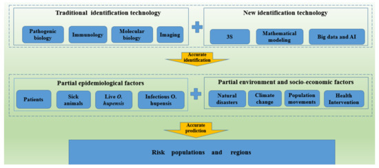 Recently, risk assessment has become an important component of schistosomiasis control. Since 2016, the National Health Administration has organized multiple risk assessments using molecular biology techniques and other means to identify risk factors and at-risk areas, with the acknowledgement that epidemics are likely to rebound once schistosomiasis prevention and control strategies are relaxed [3]. As they advance from transmission control to transmission interruption and even elimination, schistosomiasis prevention and control strategies in China are changing their focus from extensiveness to precision. Therefore, risk assessment programs require more sensitive and accurate risk identification technologies [3,18]. Because complicated epidemiological, environmental, and socio-economic factors affect schistosomiasis transmission [19,20], many different technologies are used for schistosomiasis risk identification in different areas. Traditional risk identification technologies include pathogen biology, immunology, molecular biology, and imaging techniques. New risk identification technologies based on computer and communication technologies, including 3S technologies, mathematical modeling, big data, and artificial intelligence (AI), are also gradually being used in risk identification research. This study summarizes the application of traditional and novel technologies for risk identification and suggests priorities for technology development.