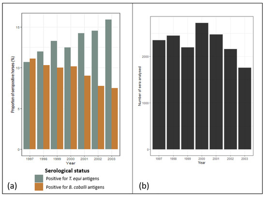 Regarding seroprevalence over time in horses positive for both parasites among infected animals, values fluctuated from 18.0% (1997) to 26.0% (2003), revealing an increase of the proportion of horses harbouring specific antibodies against both piroplasms in France throughout the years.