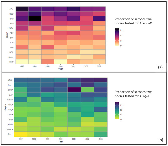 Combining the data over the entire period (1997 to 2003), the number of tested sera varied from 350 in Brittany to 3151 in Normandy (Figure 1). Spatial analysis of seroprevalence revealed that positivity ranged from 5% in Brittany and Normandy to 27% in Auvergne-Rhône-Alpes for T. equi (Figure 1a), and from 3% in Brittany to 25% in Auvergne-Rhône-Alpes for B. caballi (Figure 1b). The highest seroprevalences for B. caballi and T. equi were observed in 5 out of 12 regions: Auvergne-Rhône-Alpes, Provence-Alpes-Côte d’Azur, Occitanie, Burgundy-Franche-Comté and New Aquitaine. On the contrary, the seven northern-most regions of France showed low seroprevalence for both piroplasms (<5%) (Figure 1).