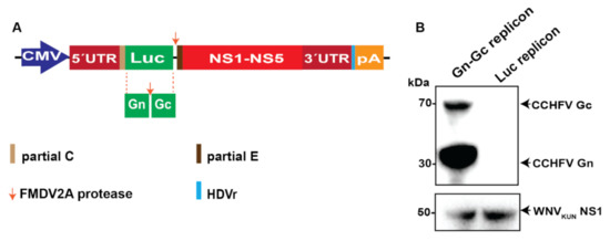 The WNVKUN replicon was constructed based on the WNVKUN sequence (accession number AY274504), as described previously [24]. To generate the WNVKUN replicon expressing the CCHFV Gn and Gc, the CCHFV Hoti strain Gn and Gc genes were PCR-amplified from the M segment cDNA clone (accession number MH483985.1) with suitable primers to create a FMDV2A between the Gn and Gc and suitable restriction sites flanking the Gn–Gc. The fragment was then substituted with the Luc gene in the WNVKUN replicon by suitable restriction reactions and ligations.