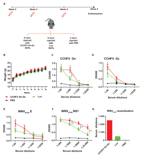 CCHFV Gn–Gc RVPs induced seroconversion to CCHFV Gn and Gc and enhanced seroconversion to WNVNY99 NS1, E. (A) Schematic illustration of the mice immunization schedule. Mice were subcutaneously immunized three times at weeks 0, 2, and 5 with RVPs expressing CCHFV Gn–Gc (6 mice), Luc (6 mice), or phosphate-buffered saline (PBS) (3 mice). (B) Mouse weight from one week before the experiment to the mouse-euthanized day. Mice sera from the study groups were diluted and assayed with enzyme-linked immunosorbent assays (ELISA) to measure antibody titers against CCHFV Gn (C), CCHFV Gc (D) WNVNY99 E (E), and WNV NY99 NS1 (F). The end-point titers were determined as there was no difference in the measured optical density values at 450 nm (OD450) between the vaccinated group and the control group. The experiments were conducted with two technical repeats. The p values are indicated using * p < 0.05 and ** p < 0.01. (G) Serum titers that elicited 50% reduction in the WNVKUN plaque number. Sera from experimented animal were combined before assaying.