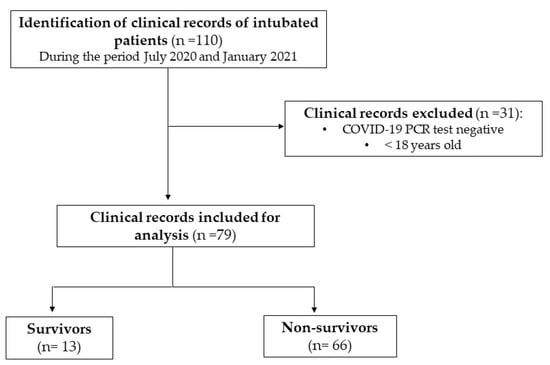 One hundred and ten clinical records of patients who required intubation due to hypoxia were identified in the public O.P.D. Hospital Civil de Guadalajara “Dr. Juan I. Menchaca, between July 2020 and January 2021. Of these, only 79 clinical records met the criteria for inclusion in the analysis (Figure 1). It was found that the average age was 57.7 ± 12.8 years; 73.4% corresponded to men, and the remaining 26.6% were women. Most of the patients at the time of intubation already had comorbidities in addition to COVID-19. The most common comorbidity was SAH (46.8%), followed by type 2 diabetes mellitus (DM2) (44.3%) and chronic kidney disease (3.8%), as well as other diseases, such as lung cancer, breast cancer, hypothyroidism, and liver cirrhosis (1.26%). Overall, 27.8% of the patients were smokers, and the average weight was 86.6 ± 23.9 kg (Table 1).