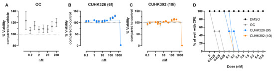 The percentage of MDCK cell viability (n = 4, mean ± standard deviation, SD) measured in the cytotoxicity assay of (A) OC, (B) CUHK326 (6f), and (C) CUHK392 (10i) revealed by neutral red assay at 3 days post incubation. The percentage of each drug concentration was in reference to vehicle control. (D) Percentage of well with cytopathic effect with 100 TCID50 IVA447 at 3 days post infection with DMSO, OC, CUHK326 (6f) and CUHK 392 (10i) by dilution assay. All MDCK wells treated with vehicle control (DMSO) had 100% CPE.