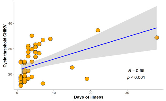 Correlation between cycle threshold chikungunya virus (CHIKV) and number of days of illness. Spearman’s rank correlation coefficient (R) and p-value were calculated between variables (n = 48).