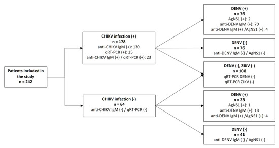 Flowchart summarizing the diagnosis performed in the 242 samples analyzed in this study. CHIKV: Chikungunya virus; DENV: Dengue virus; ZIKV: Zika virus.