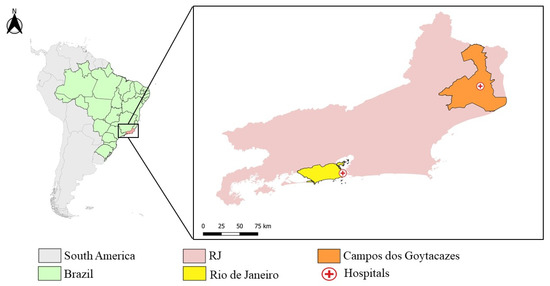 RJ is the third most populated state in Brazil, with 17,463,349 million inhabitants and 43,750,426 km² of territory, located in the Brazilian southeast region [72]. The state’s capital, the city of RJ, is located in the south of the state, and has an estimated population of 6,775,561 people and 1,200,329 km² [73]. Campos dos Goytacazes, located in the north of the state (Figure 4) has a bigger area (4,032,487 km²), but a smaller population of 514,643 people [74].