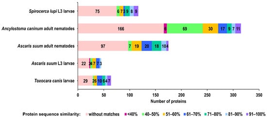 The secretome proteins of A. simplex (s.s.) were compared with those of selected nematodes to determine similarities and differences in their profiles. The following secretomes had the largest number of highly similar proteins (≥70% similarity) to those of the A. simplex secretome: adult Ascaris suum (32 proteins), adult Ancylostoma caninum (27 proteins), and L3 larvae of Spirocerca lupi (26 proteins). Fewer highly similar proteins were detected in the secretomes of Toxocara canis larvae (17 proteins) and Ascaris suum L3 larvae (three proteins). Among the highly similar proteins, homologs of the following A. simplex proteins were the most common: peptidyl-prolyl cis-trans isomerase (A0A0M3JT42), which has homologs in adult A. caninum, adult A. suum, L3 larvae of A. suum, and L3 larvae of S. lupi, and an uncharacterized protein (A0A0M3JWS2) and putative actin (A0A0M3J0M4), both of which have homologs in adult A. caninum, adult A. suum, L3 larvae of S. lupi, and T. canis larvae. Details of the comparison of secretome proteomic profiles are presented in Figure 1 and Supplementary Files S1.3–8.