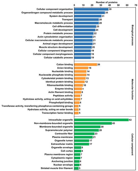 LC-MS/MS analysis resulted in the identification of 158 proteins that occurred in all biological replicates. All protein identifications were based on the presence of at least one unique peptide. Of all identified proteins, 85 had at least two unique peptides detected in three biological replicates. The molecular weights (MWs) of proteins ranged from 4 to 811 kDa, and their isoelectric points (pI) ranged from 4 to 8.99. The majority of the proteins had MWs below 50 kDa (116 proteins) and a pI below 6.6 (107 proteins). All of the 158 proteins analyzed in this study are listed in Supplementary File S1.1. Mascot results of proteins identification within individual biological replicates are presented in Supplementary File S1.2.