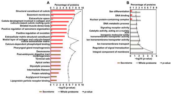 The top 20 overrepresented (A) and all underrepresented (B) GO terms in descending order of frequency in the secretome; bars show the percentages of proteins in the secretome and the whole proteome of A. simplex that are associated with the GO term; calculated GO enrichment p-values (−log10(p-value)) are plotted in the chart.