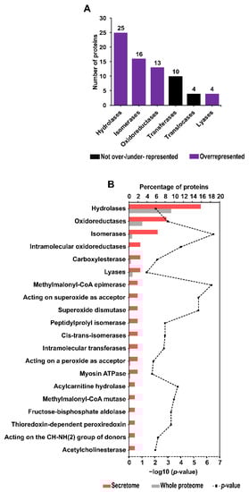 As determined using the OmicsBox software, 38 enzymes (including enzyme classes/subclasses) were overrepresented in the secretome compared to the whole A. simplex proteome. Based on the calculated P-values, the most overrepresented enzymes were isomerases (p-value = 3.08 × 10−7), methylmalonyl-CoA epimerase (p-value = 4.31 × 10−7), acting on superoxide as acceptor (p-value = 4.26 × 10−6), and superoxide dismutase (p-value = 4.26 × 10−6). No underrepresented enzymes were found in the Anisakis secretome. Figure 4B shows the 20 overrepresented enzymes in descending order of their abundance in the secretome. Details of the enzyme enrichment analysis are presented in Supplementary File S1.15.