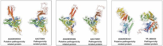 Comparison of the predicted tertiary structures of the 3 top-ranked putative pathogenicity-related proteins against their homologs with confirmed pathogenic properties. UniProt accession numbers of putative pathogenicity-related proteins and GenBank accession numbers of pathogenicity-related proteins are displayed in the figure.