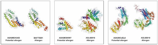 Comparison of the predicted tertiary structures of the 3 top-ranked potential allergens against their homologs with confirmed allergen properties. UniProt accession numbers of potential allergens and GenBank accession numbers of allergens are displayed in the figure.