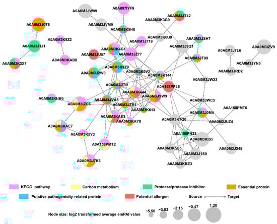 The protein interaction network was established using STRING and showed predicted interactions between ES proteins of A. simplex (s.s.). Fifty-three proteins involved in the interaction network were revealed with high prediction confidence. Twenty-five of these proteins were associated with KEGG metabolic pathways, particularly carbon metabolism, in which ten proteins were involved. Furthermore, proteins involved in the interaction network were associated with the following groups: essential proteins (21 proteins), proteases/protease inhibitors (16 proteins), potential allergens (11 proteins), and potential pathogenicity-related proteins (seven proteins). Twenty-nine proteins were assigned to only one of the groups listed above, and eleven were categorized into several groups simultaneously. Nineteen proteins from the interaction network were not assigned to any of the explored groups. The detailed analysis of the protein interaction network is shown in Figure 8.