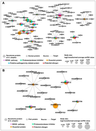 Analysis of the predicted protein-protein interactions between the A. simplex (s.s.) secretome and hosts. Interactions with human proteins are presented in part (A), and interactions with fish (Atlantic herring) proteins are presented in part (B). UniProt accession numbers of proteins are displayed in the interaction network.