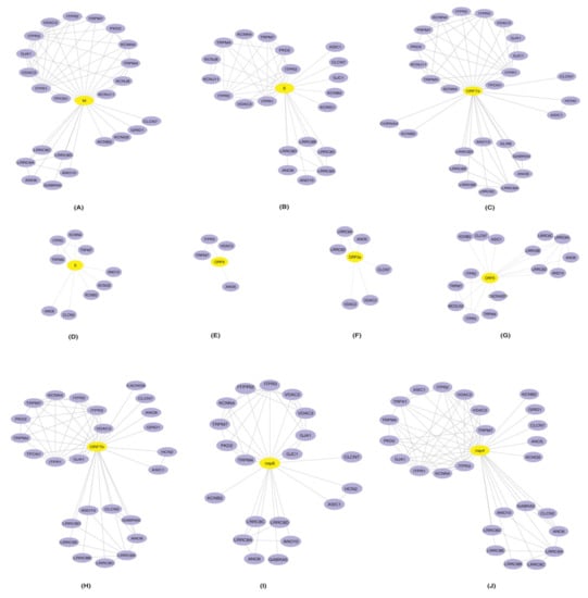 Representation of protein–protein interaction networks of HICs-SARS-CoV-2 proteins: protein–protein interactions of human ion channels (HICs) were generated using STRING database (purple color nodes). Furthermore, HICs interaction networks were overlaid with SARS-CoV-2 proteins (A) M, (B) E, (C) ORF7a (D) S, (E) ORF6, (F) ORF3a, (G) ORF8, (H) ORF7b, (I) nsp6 and (J) nsp4. Yellow color node represents SARS-CoV-2 proteins and human ion channels are represented by the purple color node.