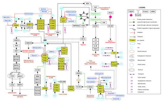 Schematic depiction of possible reactions induced by severe acute respiratory syndrome coronavirus 2 (SARS-CoV-2) via interactions with human ion channels (HICs). The signaling pathway map depicts the biological processes affected upon SARS-CoV-2 infection and the drugs interacting with HICs. The edges representing the relationship between the nodes are provided in the legend.