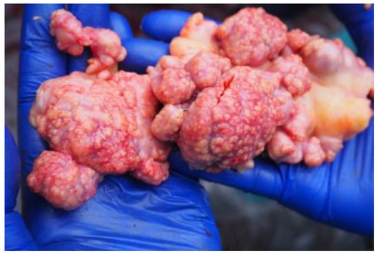 Clinical signs were limited to exercise intolerance in one animal. In the last test before death or euthanasia in the euthanized European bison, the TST result was positive in one out of eight and weakly positive in three; IGRA was positive in five out of ten (Table 1). In European bison tested with IGRA more than once, the outputs in samples stimulated with bovine PPD increased over time. A mild swelling of the upper eyelid was seen in three animals (weak positive), and a marked swelling of the upper eyelid with purulent discharge was seen in one animal (strong positive) (Figure 1). In the post-mortem examination, tuberculous lesions (Figure 2) and positive culture results were observed in five out of ten individuals. More detailed results are presented in Table 1. The results of the animals subjected to five ante-mortem tests are presented in Table 2. All isolated strains were identified as Mycobacterium caprae.